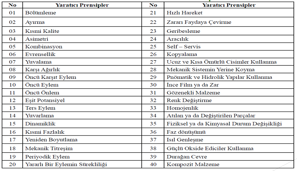 40 Yaratıcı Prensip Altshuller ve ekibinin incelediği 200.000 patent sonrası oluşturulmuştur. 40 yaratıcı prensip de çelişki matrisi ile beraber zamandan zamana gelişmiştir. Çelişki Matrisinde kesişen özelliklerdeki numaralar bizi 40 yaratıcı prensibe götürür. Prensibin bizi önerdiği şekilde problemi çözüme kavuştururuz.